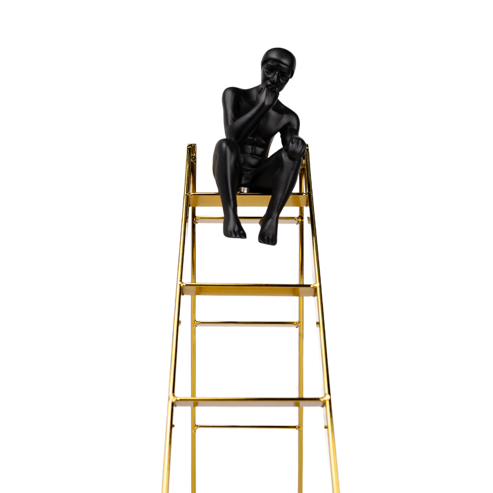 Una pieza decorativa moderna que transmite calma y reflexión. Este accesorio muestra la figura de un hombre sentado en una escalera, elaborada en metal con acabado elegante. Ideal para añadir un toque artístico y minimalista a cualquier espacio.