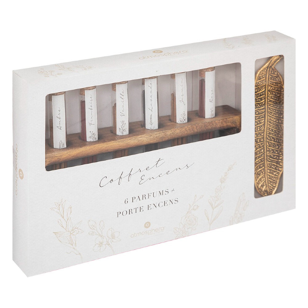La caja «Namasté» cuenta con un soporte de madera de mango que contiene 7 tubos de incienso de aromas variados. Fabricados en vidrio y cerrados con tapones de corcho, cada tubo contiene varias varillas de colores que aportarán un soplo de aire fresco a su decoración una vez colocados en el soporte de metal