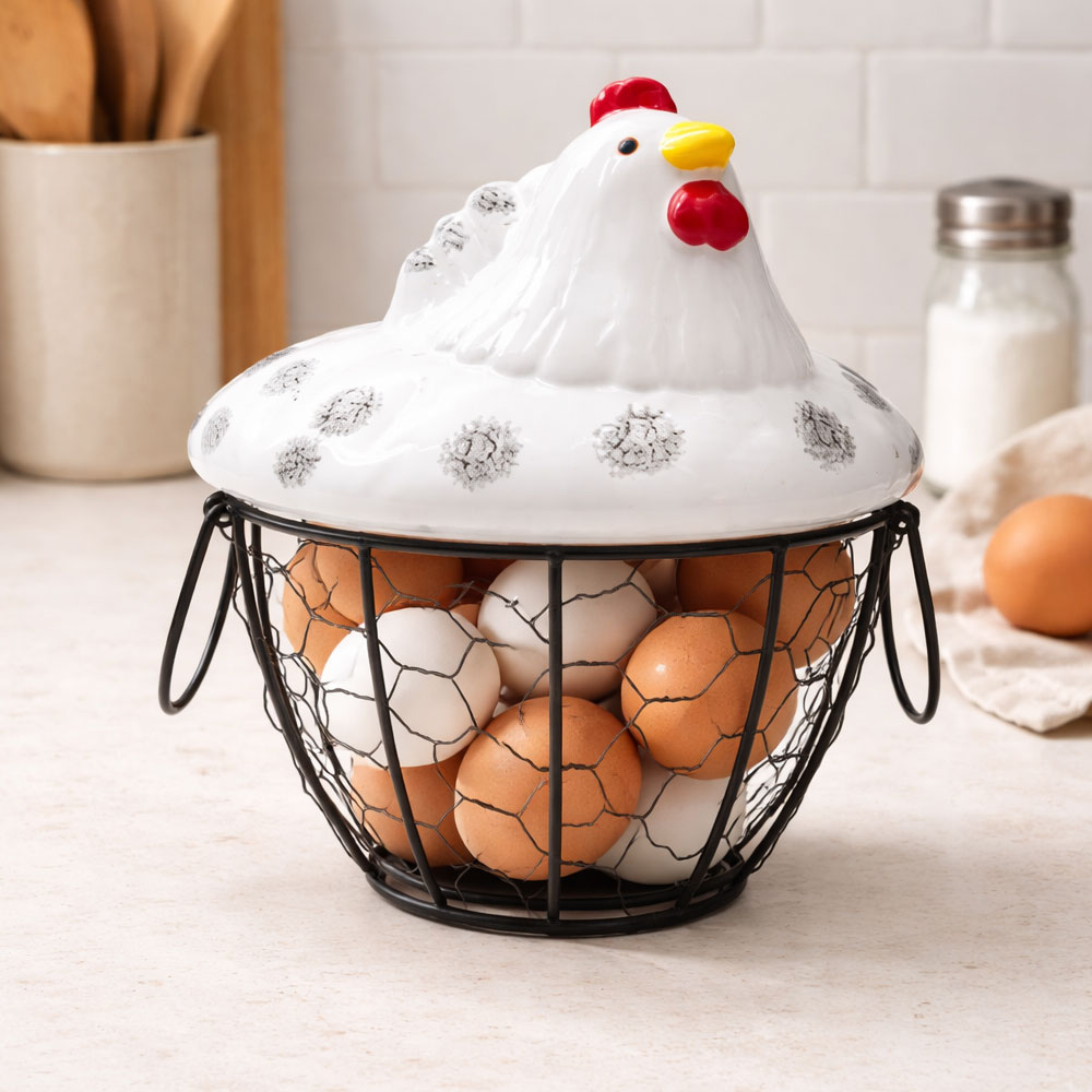 Canasta Para Huevos En Forma De Gallina Blanca De Ceramica Y Metal 16X19 Cm