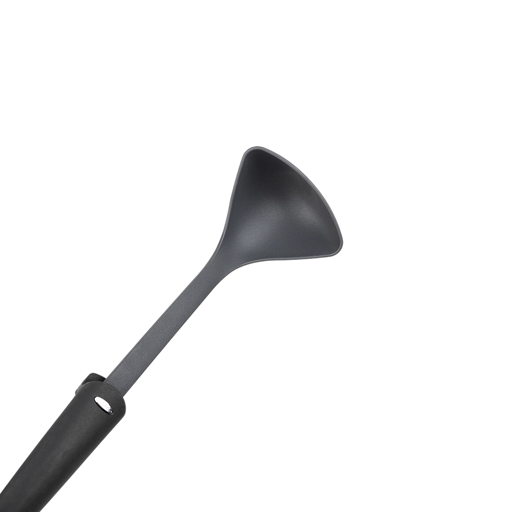 Cucharon antiadherente con cabeza en Nylon 100% puro y mango en goma antiresbalante. El diseño del mango permite mantener levantada la cabeza del utensilio cuando esta en posición horizontal evitando el contacto con la superficie donde lo apoya para mayor higiene y reduccion de las manchas en la superficie de trabajo, resistente hasta 210 grados centígrados. Utensilio apto para todo tipo de baterias de cocina especialmente recomendado para las que poseen recubrimiento antiadherente. Ideal para servir sopas, cremas y salsas. Así como también, para servir jugos de frutas y tizanas.