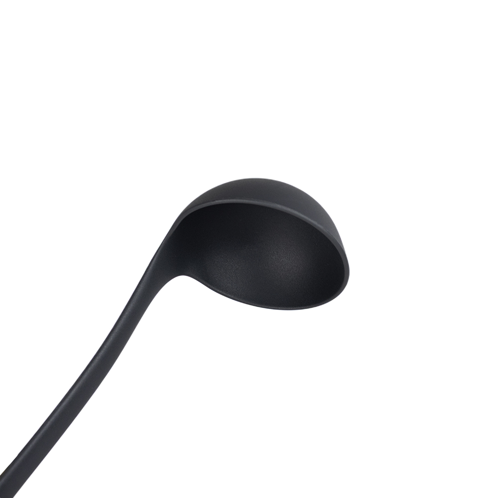 Cucharon antiadherente con cabeza en Nylon 100% puro y mango en goma antiresbalante. El diseño del mango permite mantener levantada la cabeza del utensilio cuando esta en posición horizontal evitando el contacto con la superficie donde lo apoya para mayor higiene y reduccion de las manchas en la superficie de trabajo, resistente hasta 210 grados centígrados. Utensilio apto para todo tipo de baterias de cocina especialmente recomendado para las que poseen recubrimiento antiadherente. Ideal para servir sopas, cremas y salsas. Así como también, para servir jugos de frutas y tizanas.