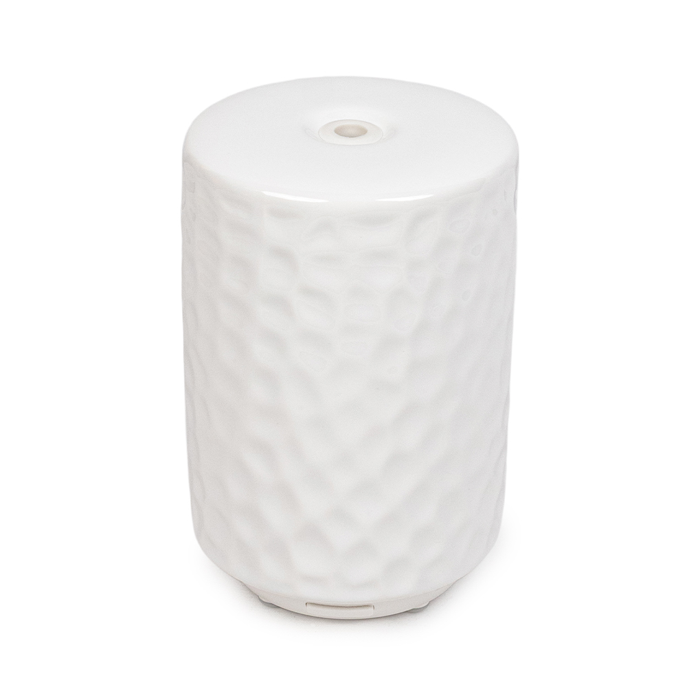 Difusor con cuerpo en cerámica y tanque de plástico de 100 ml, mediante vibraciones ultrasónicas esparce una fina niebla, al tiempo de humidificar el ambiente y conservar las propiedades de las esencias y los aromas.