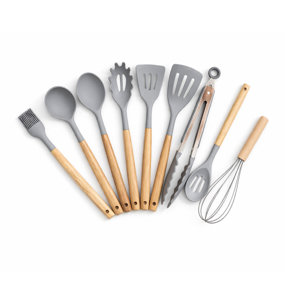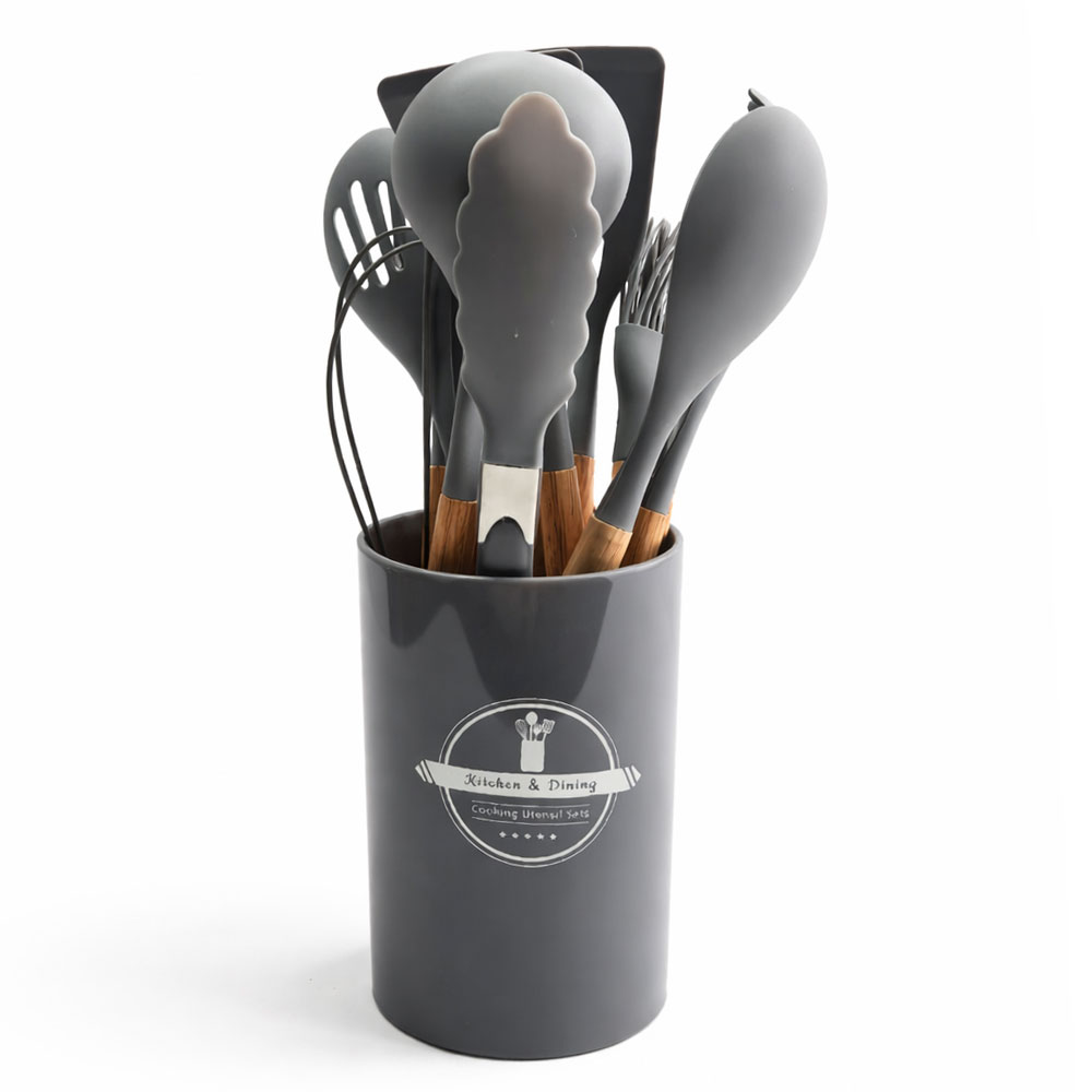Juego De 12 Accesorios De Cocina Gris De Madera Con Silicon