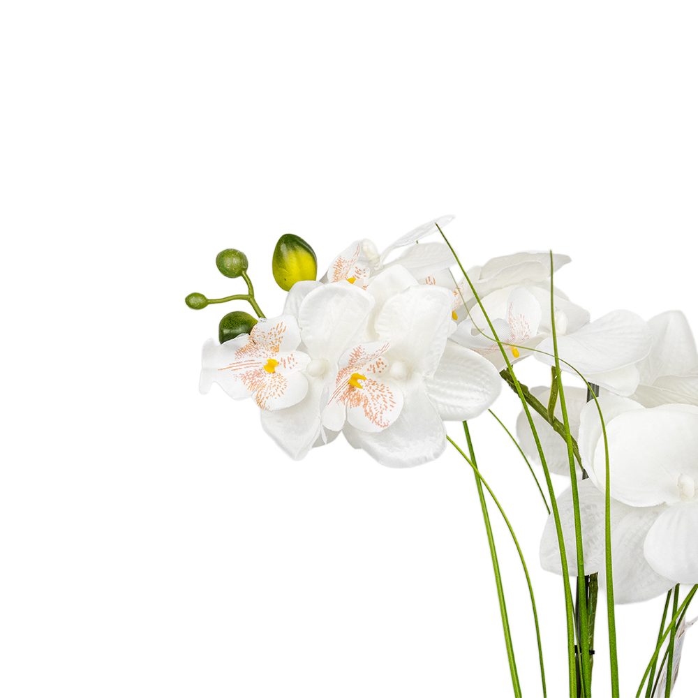Esta orquídea artificial aportará un toque poético y delicado a su decoración. Te conquistará con sus flores realistas, sus tallos altos y sus gruesas hojas verdes. La orquídea viene en una maceta brillante con guijarros decorativos. Sin mantenimiento, esta planta artificial alegrará su hogar durante años.