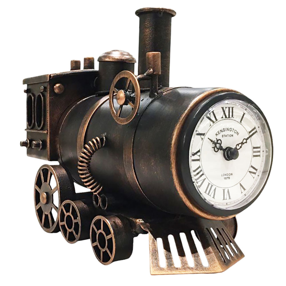 Reloj de mesa con diseño de locomotora, elaborado en resistente metal y acrílico de alta calidad. Su acabado en color bronce aporta un aire clásico y sofisticado, convirtiéndolo en una pieza decorativa única. Perfecto para añadir un toque temático sin perder elegancia, es un detalle ideal para regalar a los apasionados de las locomotoras y el mundo ferroviario.