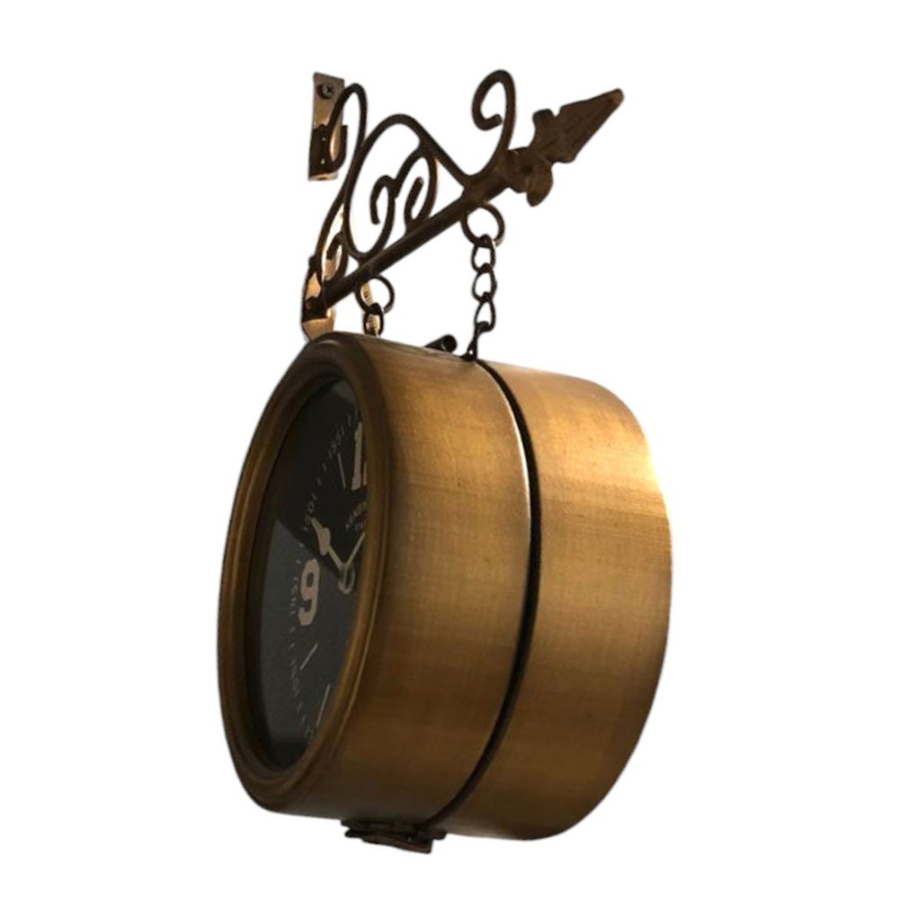 Reloj de pared de doble vista, elaborado en metal y vidrio con un elegante acabado dorado. Su diseño versátil permite apreciar la hora desde distintos ángulos, convirtiéndolo en la pieza perfecta para pasillos y áreas de tránsito. Combina funcionalidad y estilo, aportando un toque clásico y sofisticado a la decoración del hogar o la oficina.